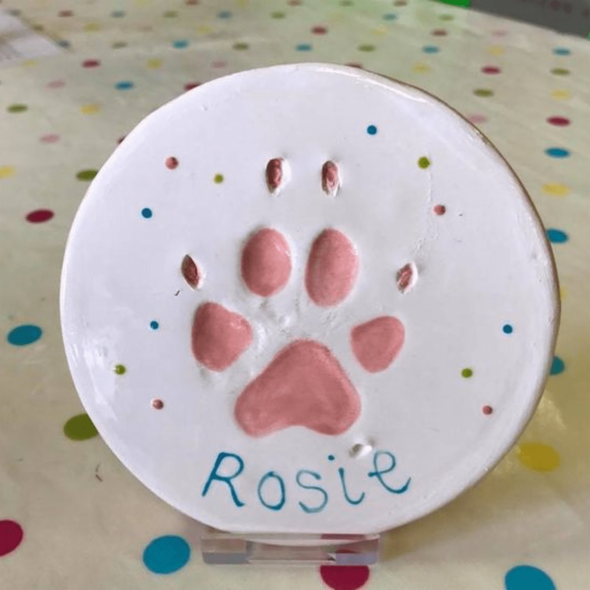 To make this the best experience for your pup, it will be best to wait until they are a bit more relaxed after a long walk or a day of daycare. Shape the clay into a rounded disk. Press your pup’s paw firmly into the clay, ensuring the pawprint is evenly pressed for a clear print. Refer to the directions on your clay kit for baking temperatures and times to solidify your project. Wash your pup’s paw to ensure all clay has been removed. If you are interested in decorating, add paint or glitter to your final project after the clay has hardened.