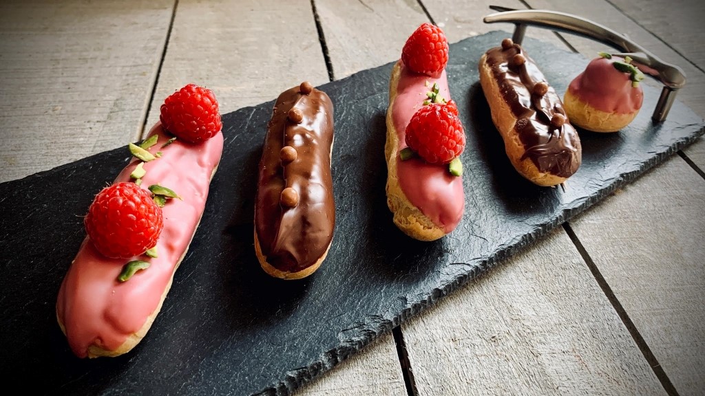 - After filling all with the cream, snip the end of the piping bag with raspberry coulis so it’s narrow enough to fit in the hole in the eclair. Gently pipe some coulis in. You’ll find you won’t need to pipe it for as long