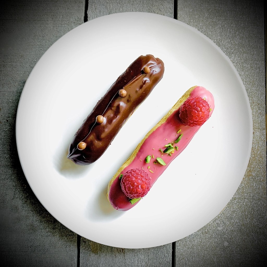 ** I completely understand that doing the full filling process is fiddly and can require a bit of practice. If you prefer shortcut to take is just to fill the eclairs with the elderflower cream and finish them with the ruby chocolate glaze as above. These can them be served with some of the raspberry coulis and pistachio butter alongside. That way you get to experience of all the wonderful flavors without it being so fussy to fill!