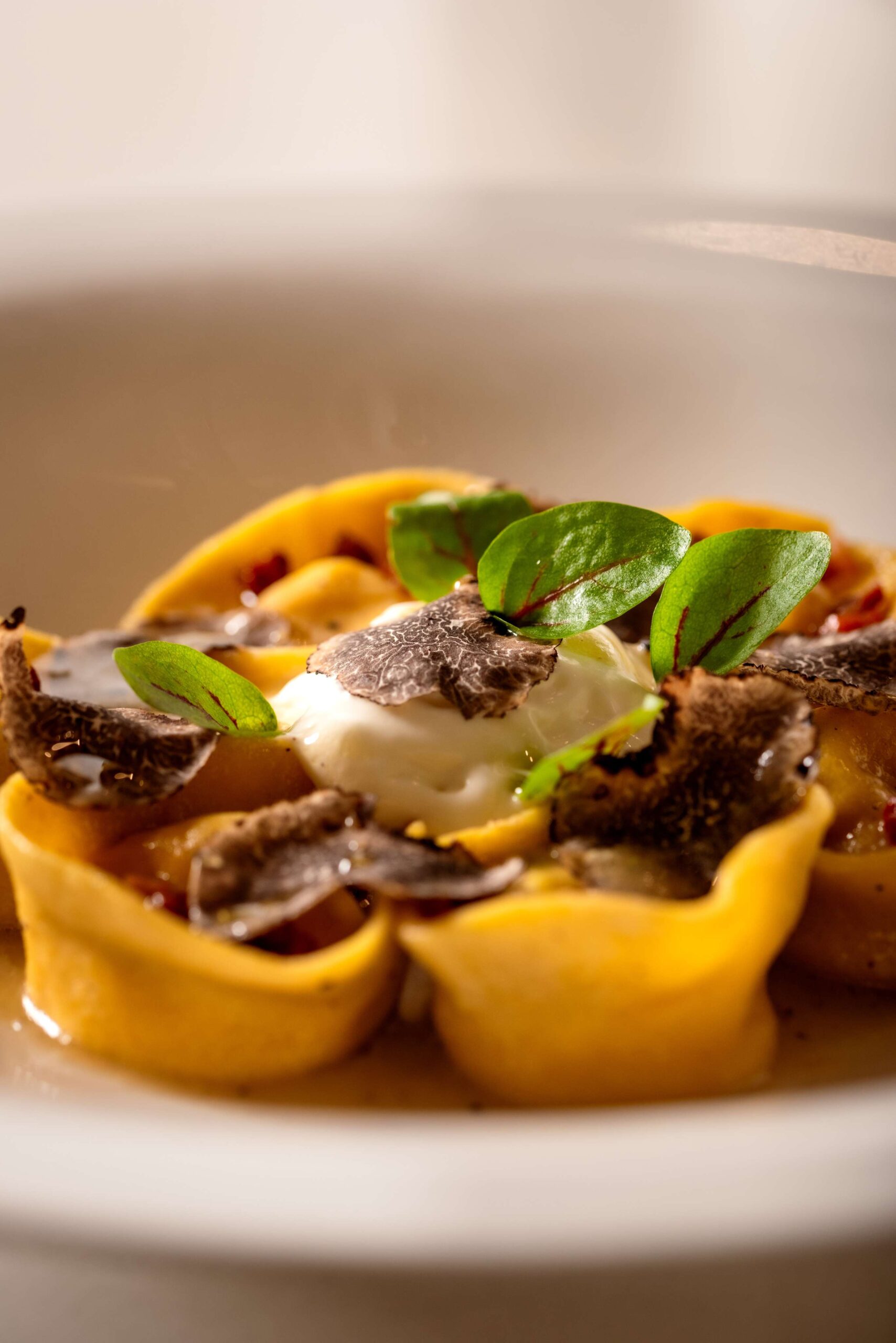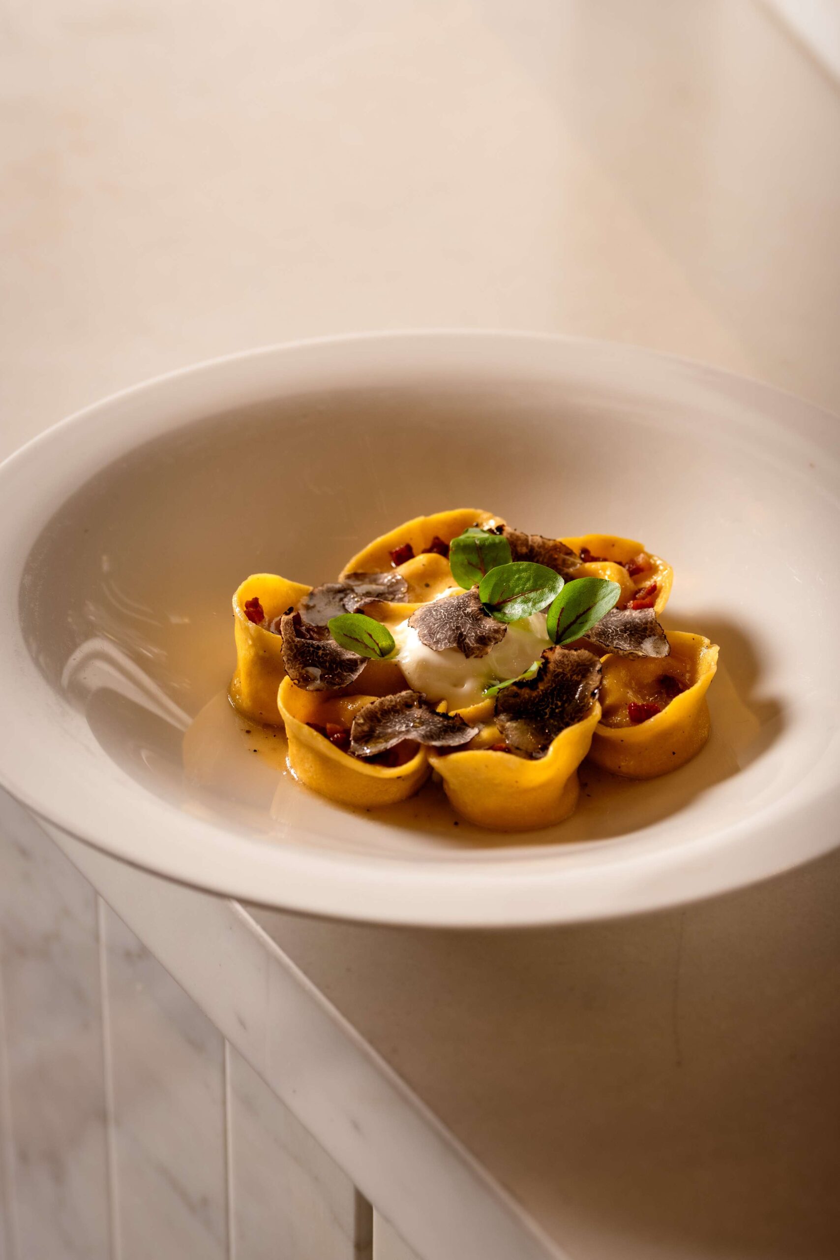 Arrange tortelli, top with guanciale, add pecorino foam, finish with truffle and black pepper.