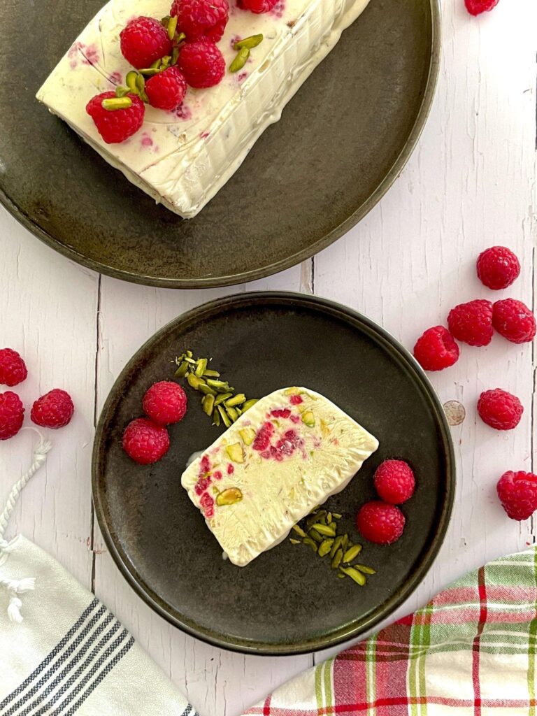 7. Slice using a gently warmed knife into slices, plate and garnish with raspberries, and Sicilian pistachio slivers.The semifreddo is best kept in the freezer till just before serving. As mentioned, a quick five minutes to slightly thaw in the summer heat and you’re good to go- just make sure you return any unsliced dessert to the freezer!