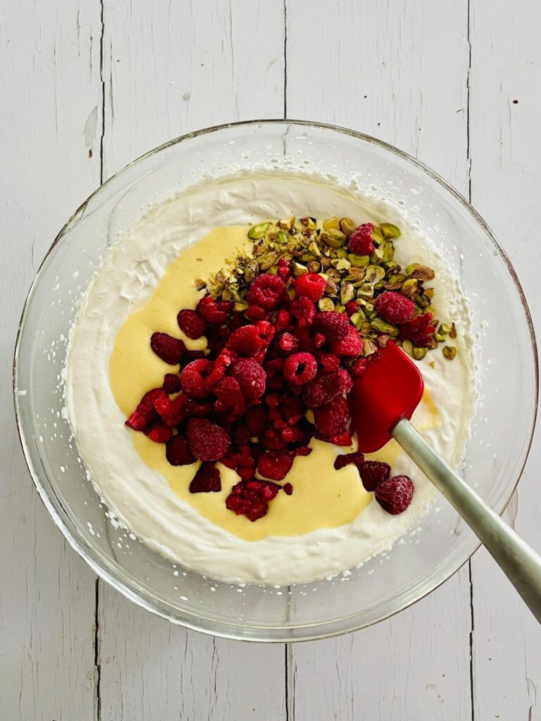 4. Transfer mixture to a large bowl. Gently fold in the whipped cream, toasted pistachios, rosewater, and two-thirds of the raspberries