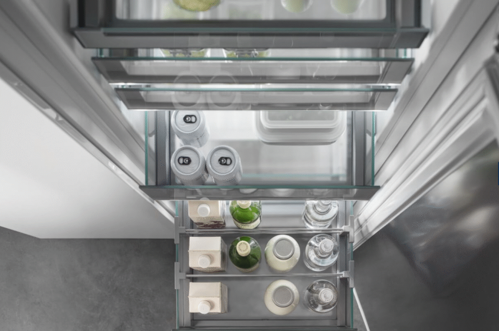 OpenStage showcases the items in your refrigerator in beautiful metal trim and shatter-resistant glass drawer. The soft-telescopic replaces traditional shelving allowing full access to every item at every level. In the bottom, practical dividers ensure bottles are held securely in place.