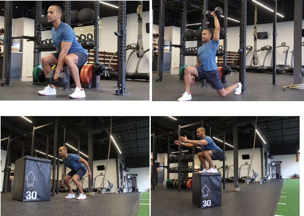 - Land by absorbing your body weight through the front heel while pushing the dumbbell up so that your arm is in a locked-out position